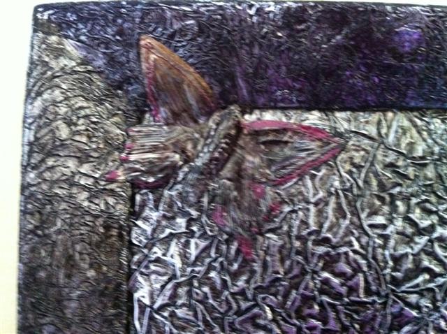 | Jag har också gjort några tavlor med vanlig aluminiumfolie, som sedan målats. Under folien har jag först limmat utstansade fjärilar för att ge en reliefverkan. Även ramen är dekorerad med folien. |